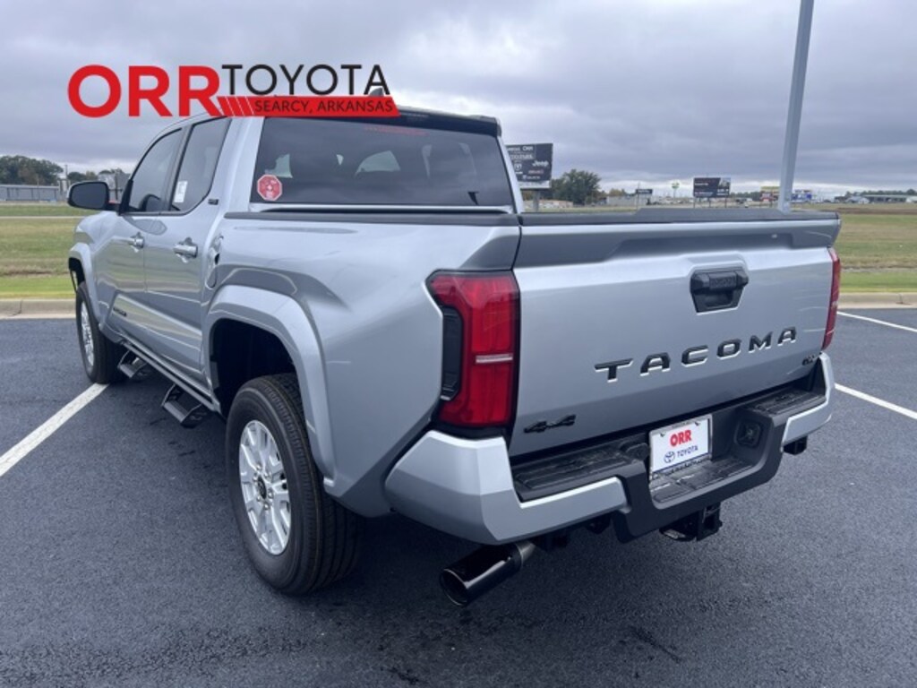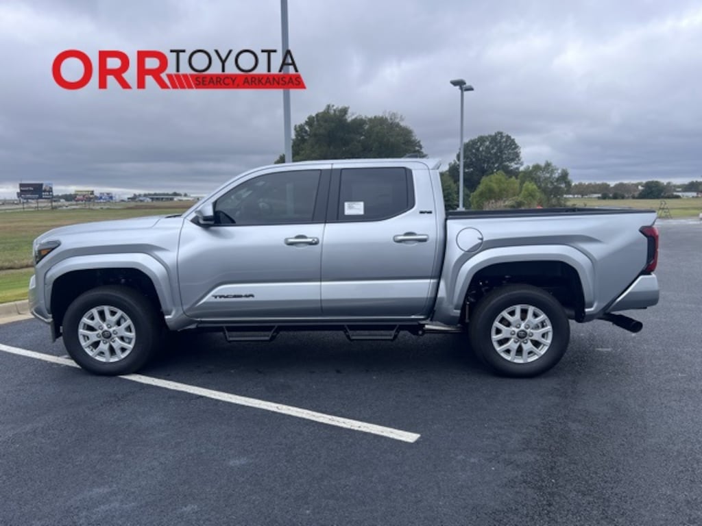 Silver 2025 Toyota Tacoma SR5 4WD 8-Speed Automatic 2.4L 4-Cylinder This Tacoma SR5 is nicely equipped with 4WD, 3.583 Axle Ratio, 4-Wheel Disc Brakes, 6 Speakers, ABS brakes, Air Conditioning, Alloy wheels, AM/FM radio: SiriusXM, Anti-whiplash front head restraints, Apple CarPlay/Android Auto, Auto High-beam Headlights, Auto-dimming Rear-View mirror, Brake assist, Bumpers: body-color, Driver door bin, Dual front impact airbags, Dual front side impact airbags, Electronic Stability Control, Emergency communication system: Safety Connect (1-year trial), Exterior Parking Camera Rear, Fabric Seat Trim, Four wheel independent suspension, Front anti-roll bar, Front Bucket Seats, Front Center Armrest, Front fog lights, Front reading lights, Fully automatic headlights, Heated door mirrors, Illuminated entry, JBL Premium Audio, Knee airbag, Low tire pressure warning, Occupant sensing airbag, Outside temperature display, Overhead airbag, Overhead console, Panic alarm, Passenger door bin, Power door mirrors, Power steering, Power windows, Radio: 8" Toyota Audio Multimedia, Rear step bumper, Rear window defroster, Remote keyless entry, Speed control, Speed-sensing steering, Split folding rear seat, Spray-On Bed Liner (TMS), Steering wheel mounted audio controls, Tachometer, Telescoping steering wheel, Tilt steering wheel, Traction control, Trip computer, Variably intermittent wipers, and Wheels: 17" Styled Alloy. 4WD.